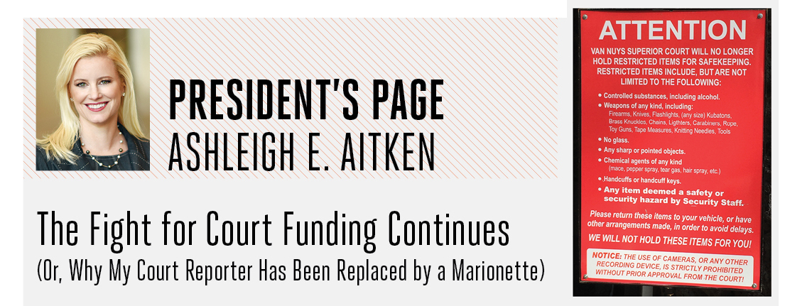 Courtroom funding issues arise every spring, as the courts struggle to survive the yearly funding cuts. Our local court has weathered the storm quite well due to superb financial planning and the ability to rely (at least for a short while) on its healthy reserves. The prognosis for Orange County is “not bad,” but as Court Executive Officer Alan Carlson remarked, “Saying we are pleased with the budget is like the Titanic captain being grateful there was only one iceberg.” At least Alan still has his sense of humor.