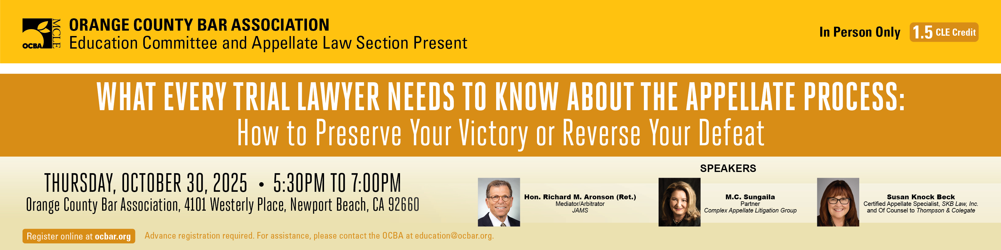 The OCBA's annual Board of Directors Election closed at 2:30 p.m. on Monday, September 29, 2025. In accordance with the OCBA bylaws, 2025 President-Elect Shirin Forootan (Forootan Law) will succeed to the Presidency in 2026. The rest of the 2026 Executive Committee will be comprised of President-Elect Eric V. Traut (Traut Injury Law), Treasurer Sharon Oh-Kubisch (Kahana & Feld LLP), newly-elected Secretary Casey R. Johnson (Aitken Aitken Cohn LLP), and Immediate Past President Mei Tsang (Umberg Zipser LLP).