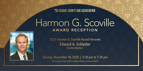 This prestigious award, which was established in 1990 in honor of then-retiring Appellate Court Presiding Justice Harmon G. Scoville, annually recognizes a member of the Orange County legal community whose career exemplifies the highest standards of the legal profession and who has contributed to the OCBA and championed our constitutional system of justice.