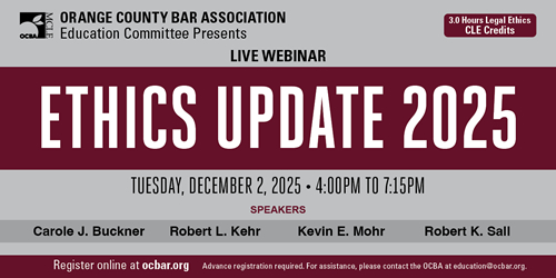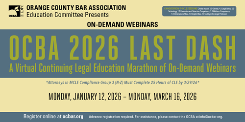 Renew your OCBA Membership for 2026 and stay connected to the Orange County Legal Community. Continue to enjoy the benefits of member pricing on CLE programs, events and access to valuable attorney resources. Make yourself visible to the Bar with advertising discounts in Orange County Lawyer magazine. Membership is based on the calendar year, so renew early to avoid any interruption in benefits. Renew Today!