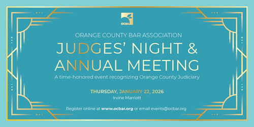 The Orange County Bar Association is proud to announce the 2026 Judges' Night and Annual Meeting featuring the installation of Shirin Forootan, Esq. as 2026 OCBA President, as well as the installation of the OCBA Officers and Directors and the OCBA Charitable Fund Directors. A highlight of the evening will be the presentation of the Franklin G. West Award, the highest honor bestowed by the OCBA. Register online today.