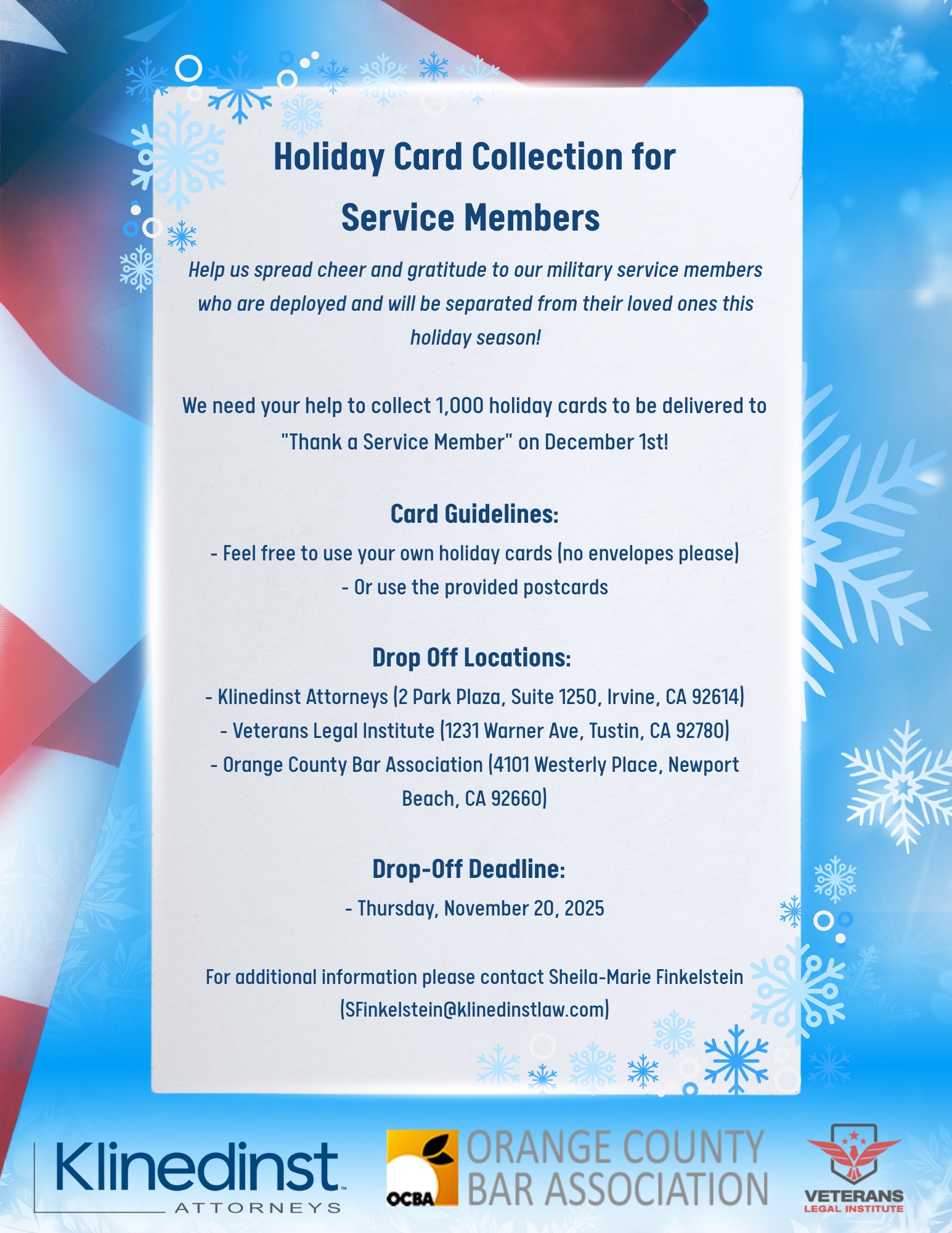 The OCBA is partnering with the Veterans Legal Institute and Klinedinst Attorneys to help spread cheer and gratitude to military service members who are deployed and will be separated from their loved ones this holiday season. We need your help to collect 1,000 holiday cards to be delivered to "Thank a Service Member" on December 1st